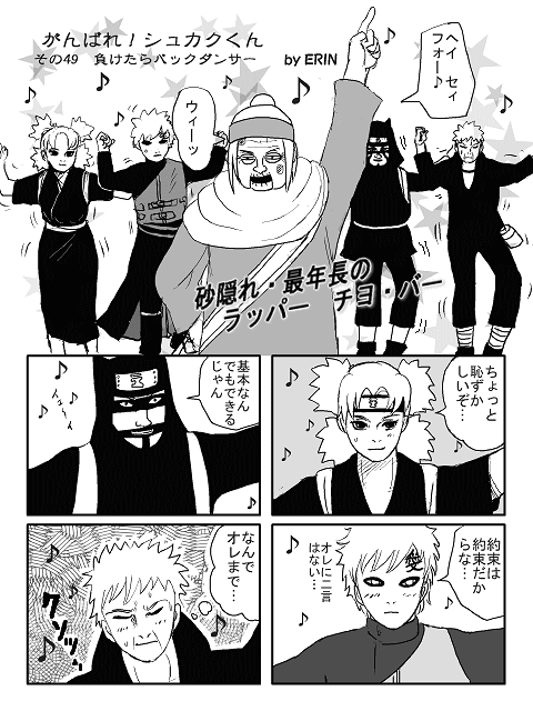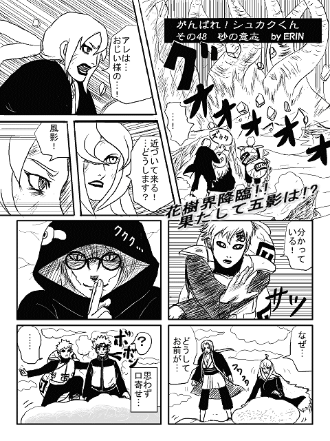 本当にご苦労様な二人組を夜中の散歩を終えた我愛羅が偶然、見かけたという設定です。