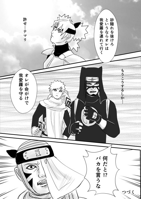 4-24 我愛羅を連れて抜け忍になると言い出したカンクロウに 果たしてバキは!? 次回、いよいよ謎が明らかになる 完結編です。 (画像クリックで完結編へ飛びます) (2014.1.26)