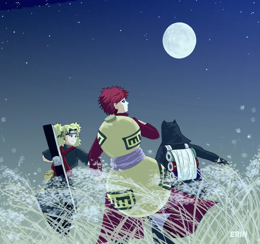 ふと立ち止まってすすき野の中に浮かぶ満月を見上げる我愛羅。 今やすっかり仲の良い三姉弟です。 これもナルトのおかげ。 (2012.9.29) NEXT