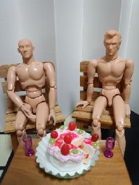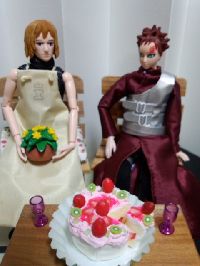 | ってことで、我愛羅の為に夜叉丸を作ってみました。服は、エプロンしか無いので、我愛羅の普段着を着用。 | 我「少し遅れたが、誕生日おめでとう。サボテンは、オレから。ケーキは、テマリの特製だ」 | 夜叉丸「そう言えば、カンクロウやバキの姿を見ませんが…」 我「彼らは、控室で待機中だ」 |
