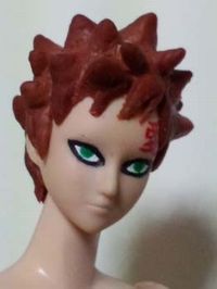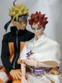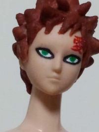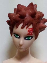 | もう少しシャープに仕上げたいところですが、(乾いてから削れるのかな…!?)粘土にもいろんな種類が有ります。初期我愛羅っぽく、髪は短めにしてみました。顔パーツもう一つあるのでそちらは、風影風にする予定です。 | 我愛羅(もどき!?)完成〜♪まだ、服がないのでとりあえずロープ風に布をはおらせてみました。ナルトと記念撮影!! | ナルト「お前…なんだか、花嫁さんみたいだってばよ」 我愛羅「…殺すぞ…」 ということで、次回は、ソーイング・マイ・ウェイ。(実家からミシンも借りてきました。はてさてどうなる事やら…) |