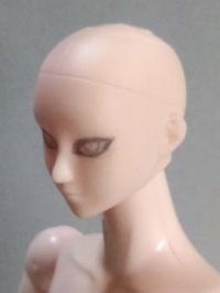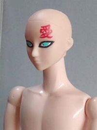 | 我愛羅のボディ(オ○ツ27男性スリム、ナチュラル)到着しとりあえず手を握り、チャクラを注入するナルト氏。 | 輪郭が何となく我愛羅っぽいオ○ツ27の顔パーツ(woman2)。ソフトで手触りのよい顔と手の素材です。 | 下書きは、鉛筆で。顔の正中線から等間隔で目の位置を決めて展開しました。 |