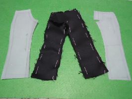 カン「長いズボンも作ろう。今回は、オーソドックスの四枚剥ぎだ。前回のスリムパンツとは、型紙が違うぞ」 我「こうしてみると見た目はでかいが、縫製すると案外小さくなるな…」 カン「手作業しやすい大きさだな」 |