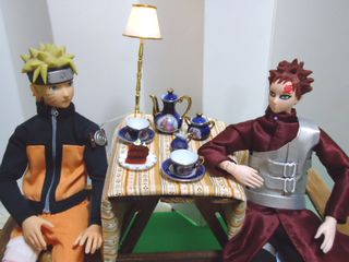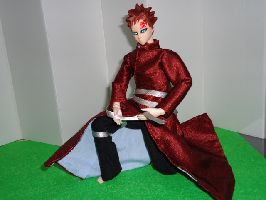 我「みろ。ナルト。オレの新しい風影の衣装を」 ナルト「お〜。ひらひら、スカートが翻ってるってばよ」 我「これは、スカートじゃない。長い上着の裾だ!!」(写真は、修正してますが、ひらひらさせるために糸で釣ってます) |